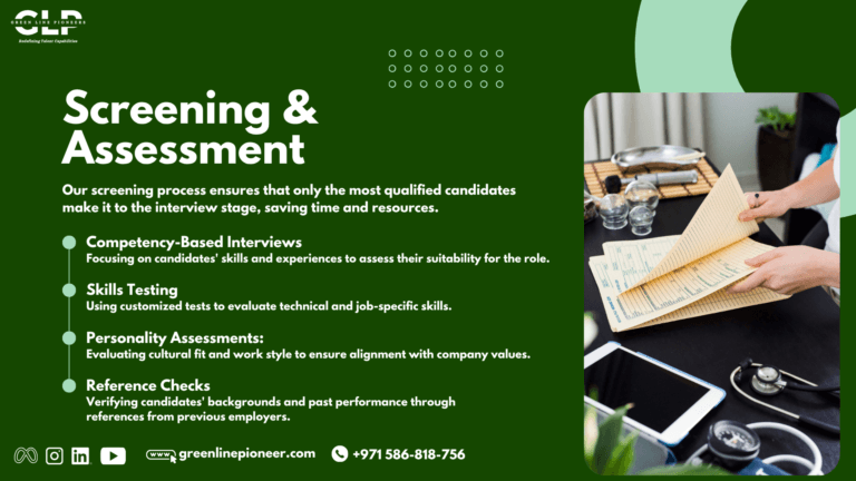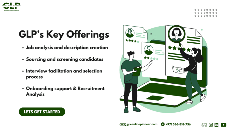An HR consultancy in the UAE, like Green Line Pioneers, assists businesses with their human resources needs, including job analysis, candidate sourcing and screening, interview facilitation, and onboarding support, ensuring companies find the right talent for their specific requirements.