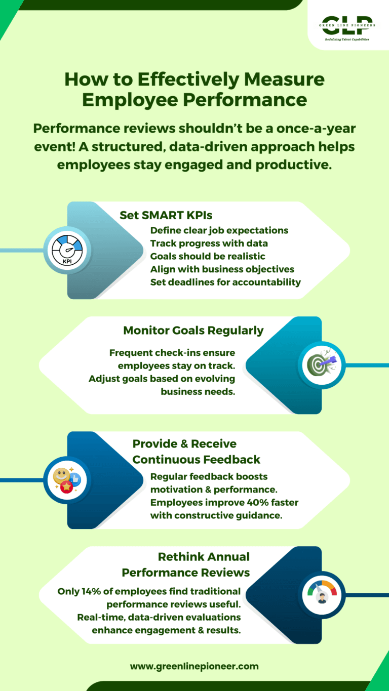 At Green Line Pioneers, we help businesses implement SMART, continuous performance measurement strategies to drive success. Don’t wait for annual reviews—embrace a data-driven, real-time performance culture today!