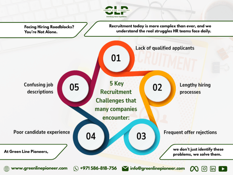 Recruitment isn’t just about filling vacancies—it’s a core business function that directly impacts growth trajectories, team productivity, and competitive advantage. In today’s UAE market, where talent competition intensifies amid economic diversification, inefficient hiring processes can stall innovation, inflate costs, and derail strategic objectives. At Green Line Pioneers, we partner with organizations to turn these challenges into opportunities for sustainable success.