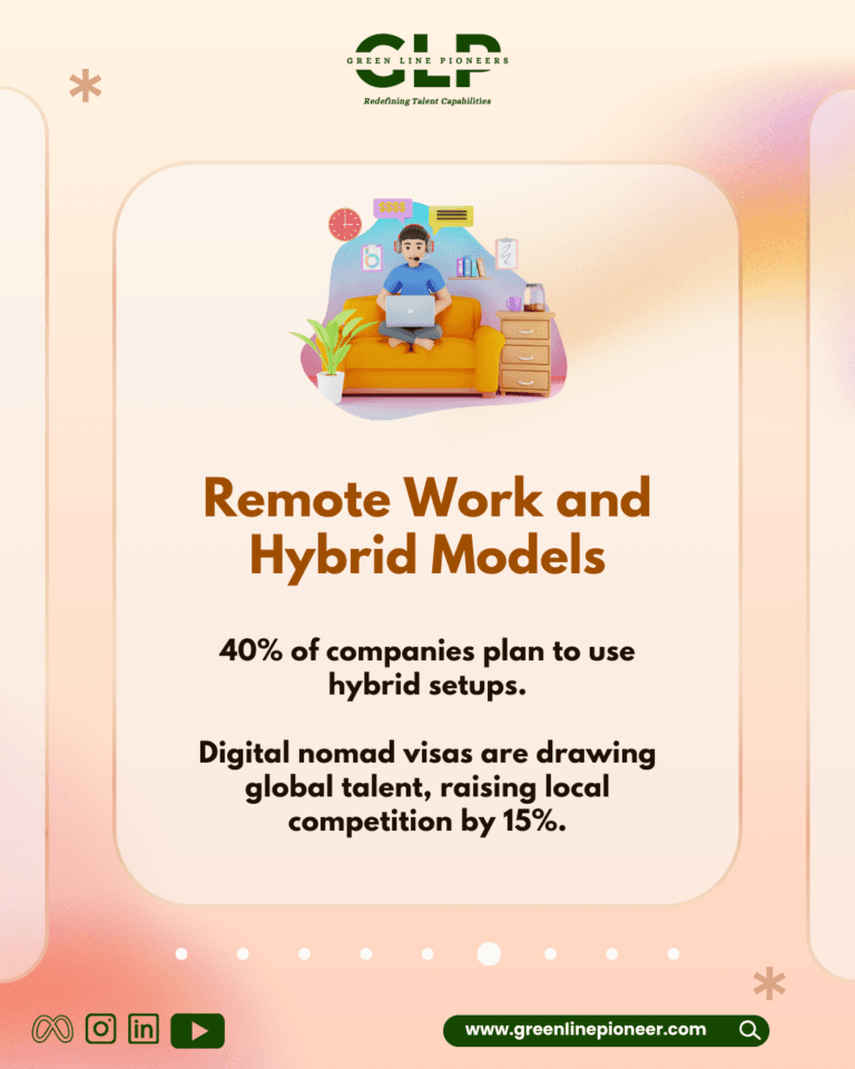 - Work Arrangements: The hybrid work model is now standard, adopted by 40% of companies in the UAE. The introduction of the Digital Nomad Visa and other remote work options is attracting global talent, increasing local competition by 15%.